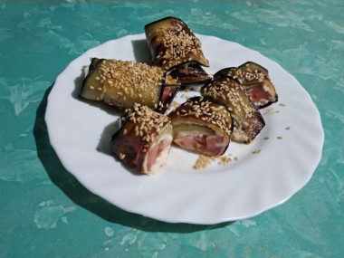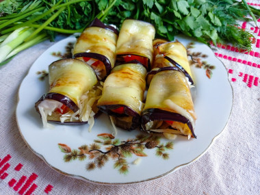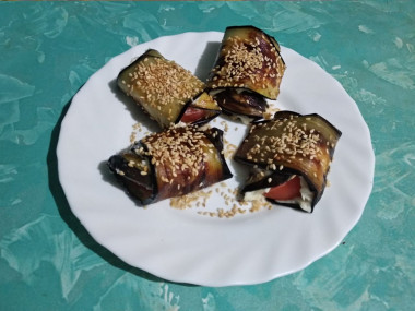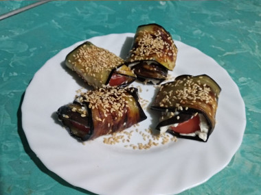 Закуску я сделала из расчёта на один небольшой баклажан. Сыр взяла гауду. У меня были помидорки черри, их и использовала, разрезав на четвертинки. Баклажан не замачивала в соленой воде. У меня получилось шесть рулетиков.