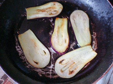 Разогрейте сковороду с растительным маслом и обжарьте баклажаны с двух сторон до румяности.
