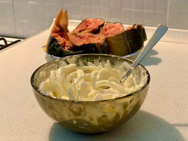Сверху на рыбу выложите лук с майонезом. Кроме лука можно еще положить в "шубку" натертые морковь и сыр.