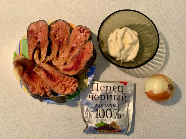 Как запечь горбушу с луком и майонезом в духовке? Подготовьте продукты. Горбуша у меня сразу в виде стейков, вы же можете купить целую рыбу и разделать ее самостоятельно. Вес указан уже тех частей, которые вы будете запекать. Способ нарезки также может быть любым — и кусочками как у меня, и широкими половинками на коже. Майонез можно заменить сметаной. Включите духовку на 190 градусов.