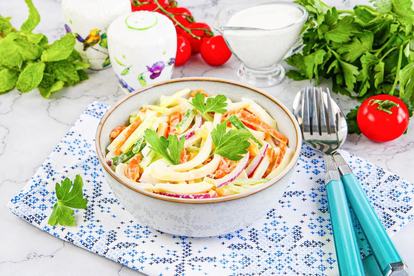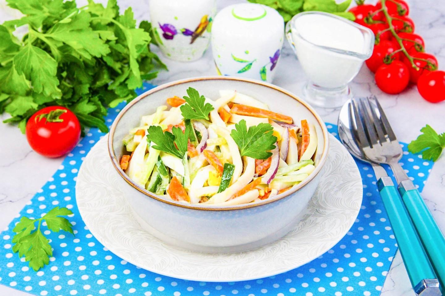 Салаты с кальмарами — визитная карточка советской и постсоветской кухни, особенно популярные в прибрежных регионах. Сочетание отварных морепродуктов с овощами и яйцом под майонезом стало классикой домашних застолий. Наш вариант с морковью и огурцом — более легкая и свежая вариация, где сметана смягчает вкус.