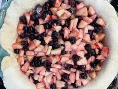 В качестве начинки у меня были яблоки и смородина, которые я смешала с сахаром и крахмалом. При следующем приготовлении, ягоды разморожу и солью с них лишнюю воду, т.к. для меня начинка была жидковата, поэтому кто любит более плотную начинку - возьмите на заметку.
