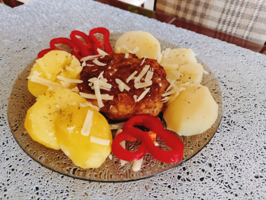 Ужин получился очень вкусным, благодаря рецепту автора Марии : фарш с сыром вкусно и просто! Фарш у меня был из свинины, бекон брала сырокопченый,сыр Российский.