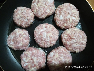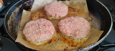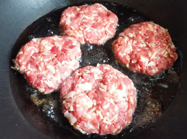 Сковороду разогрейте на среднем огне. По желанию можете добавить немного растительного масла, но в принципе хватит и того жира, который выделится при обжарке из фарша и бекона. Обжарьте котлетки с двух сторон до золотистого цвета.