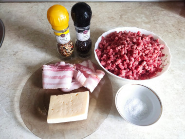 В миске соедините фарш, бекон, сыр, растительное масло и специи. Тщательно вымесите фарш до гладкости. Если хотите получить более однородную консистенцию, можете взбить фарш, сыр и бекон в стационарном блендере.