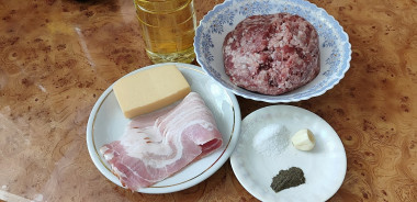 В фарш добавила мелко порезанный бекон, сыр, натертый на мелкой тёрке, масло растительное, соль,перец и хорошо перемешала.
