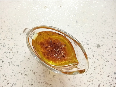 Далее сделайте заправку. Смешайте горчицу и оливковое масло до однородной массы. Оливковое масло можно заменить на обычное рафинированное подсолнечное. При необходимости увеличьте количество масла и горчицы по своему вкусу.