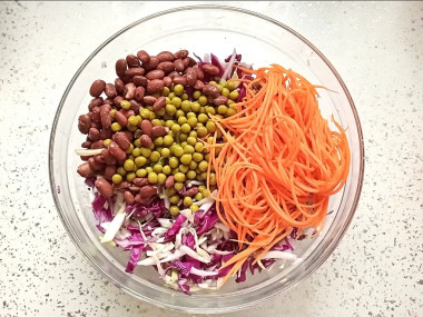Оба вида капусты оказались сочными, для выделения этого сока слегка помяла смесь капусты с солью. Морковь натерла на корейской терке для красоты. Красный лук замариновала в смеси белого винного уксуса и сахара. Мне нравится аромат этого уксуса, со свежими овощами прекрасно сочетается. Сладкого перца у меня не было, а с ним было бы еще лучше. Вместе с фасолью решила использовать для салата еще и зеленый горошек, мне кажется, они хорошо сочетаются. Для заправки взяла оливковое масло и обычную домашнюю горчицу. Я тоже думаю, что салату с фасолью и капустой нужно дать настояться некоторое время. Овощи становятся слегка маринованными, это очень вкусно!