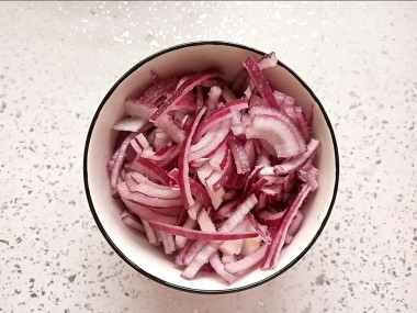 Лук очистите от кожуры и ополосните. У меня в этот раз две маленькие луковицы (репчатый и красный салатный лук). Нарежьте лук тонкими полукольцами, отправьте в глубокую небольшую миску и посыпьте щепоткой сахара (я сахара взяла чуть больше по вкусу, около 0,75 ч.л.).