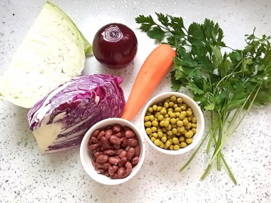 Как сделать салат с фасолью и капустой? Очень легко! Подготовьте все указанные по списку продукты. Для яркости салата я использовала два вида капусты- краснокочанную и обычную белокочанную.
