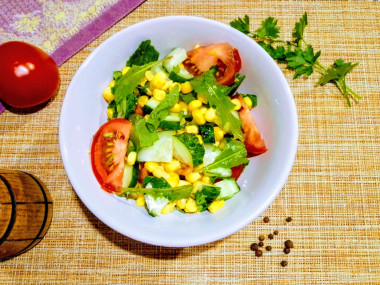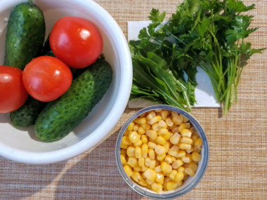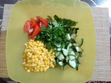 Сложите нарезанные ингредиенты в салатник, добавьте кукурузу.