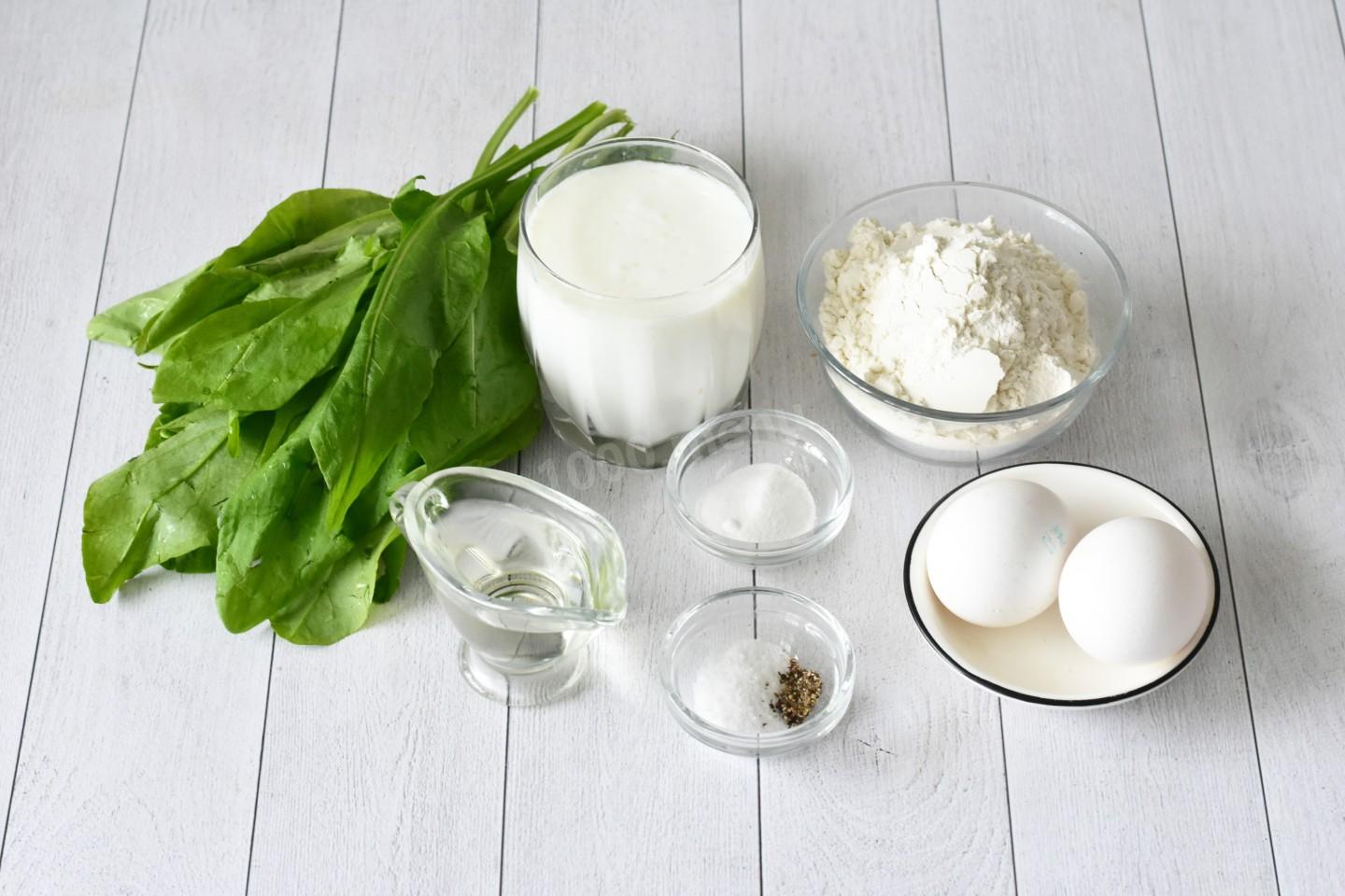 Для начала подготовьте необходимые ингредиенты. Яйца берите крупные отборные. Если яйца мелкие, возьмите 3 штуки. Кефир подойдет любой жирности, но учтите, что от влажности и жирности кефира зависит точное количество муки. У меня кефир жирностью 2,5%. Можно ли использовать замороженный щавель?Да, но его не надо размораживать. От разморозки щавель даст лишнюю воду, и тесто не схватится. Учтите: заморозка даёт более тёмный цвет начинки. Включите духовку на 170 градусов.
