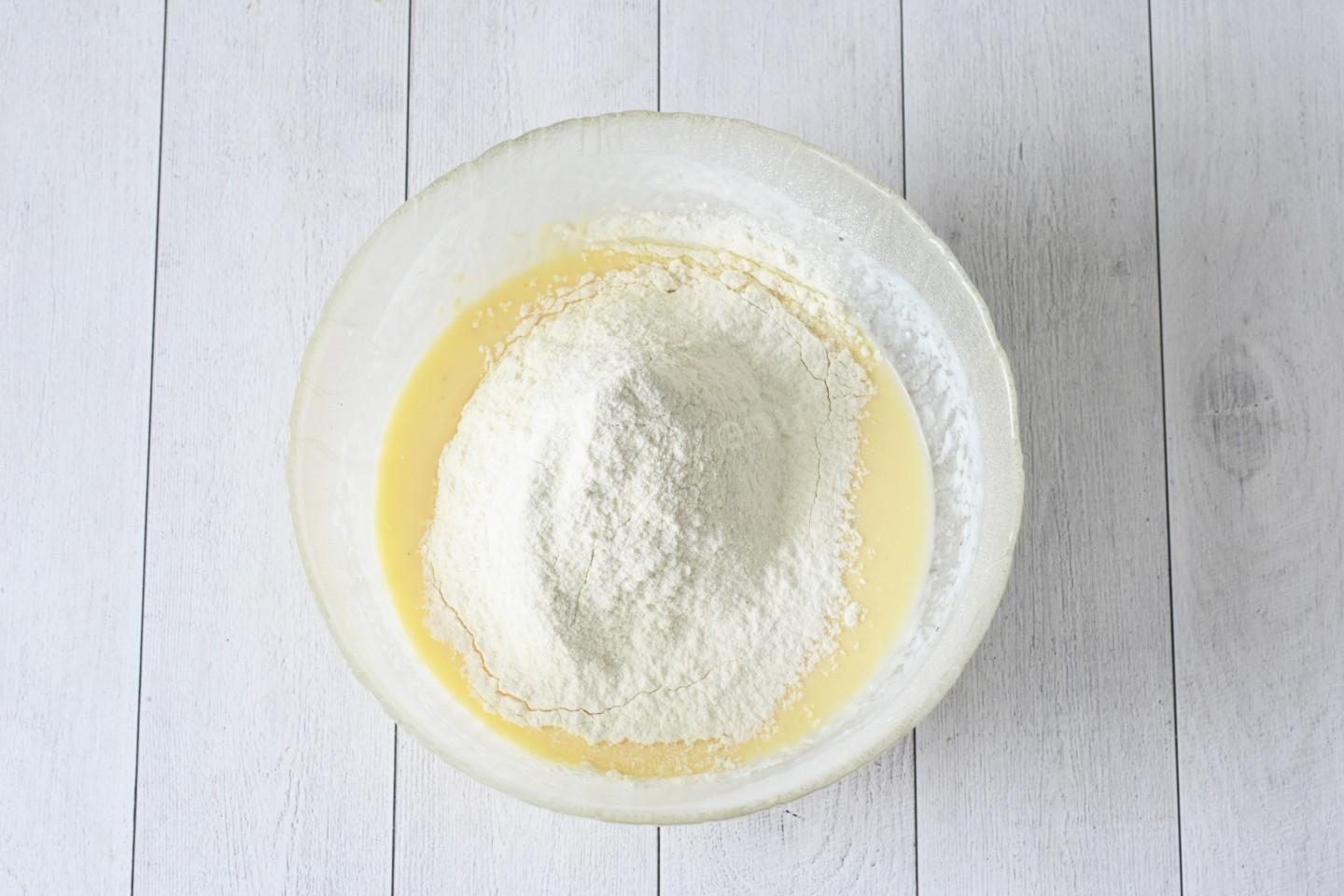 Всыпьте просеянную с содой муку и перемешайте тесто венчиком до однородности. Важно просеять муку, чтобы насытить ее кислородом. Тогда выпечка получится воздушной и хорошо поднимется при выпекании. Должно получиться полувязкое текучее тесто.