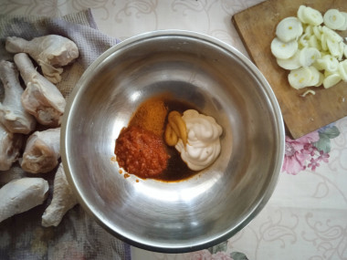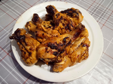 Решили на день рождение курицу на мангале в пряном маринаде. Мне понравился этот рецепт своим маринадом. Купила все необходимые ингредиенты, только лимон забыла) Аджику взяла домашнюю острую. Ножки промыла и просушила на полотенце. Лук порезала колечками. Для маринада смешала аджику, острую горчицу, майонез 67%, приправу для курицы и соевый соус. Так как домашняя аджика сильно острая, я ее положила чуть меньше. А вот соевого соуса добавила побольше. Соли вообще не клала, так как ещё и приправа солёная. Замариновала ножки с луком утром, а готовила вечером на решетке на углях. Курочка очень аппетитно пахла на мангале. Приготовила блюдо минут за 25, постоянно переворачивая решетку с ножками для равномерной прожарки.