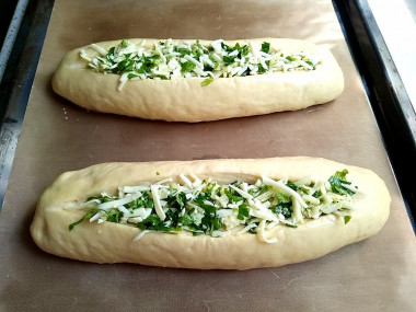 По центру каждого багета по всей длине сделайте углубления и выложите в них начинку. Сверху распределите тертый сыр. Выпекайте багеты с сыром в предварительно разогретой до 180°С духовке примерно 25-30 минут до появления золотистой корочки.