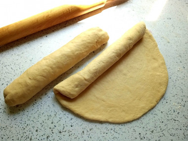 Каждую часть раскатайте на присыпанной мукой поверхности в ровный не очень тонкий прямоугольник и скатайте его в плотный рулет. Получится 2 заготовки.