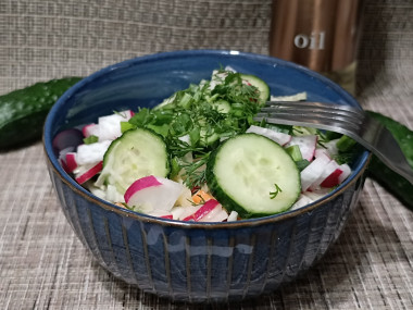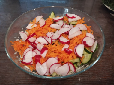 Салат получился вкусный и хрустящий, редиску я не очень люблю, но здесь она даже не чувствуется , нет горечи от неё, кушаем с удовольствием, спасибо за рецепт.