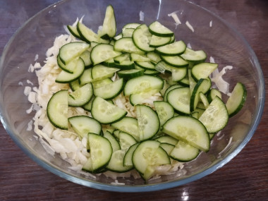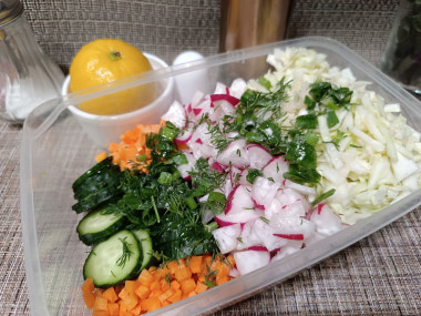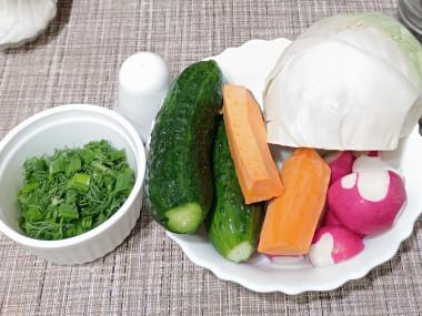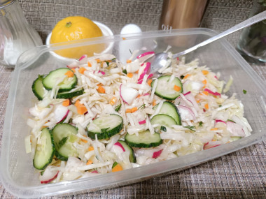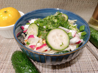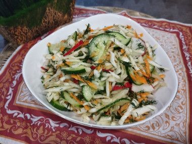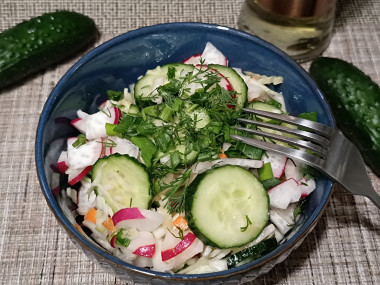 Салат весенний из капусты моркови и огурцов настолько вкусный,освежающий,что хочется его повторить. Капуста у меня на молодая,но я её нашинковала и слегка помяла,чтобы мягче была. Огурец и редис порезала полуколечками, укроп измельчила, морковь натерла на крупной тёрке. Соединила все ингредиенты, слегка посолила,добавила немного яблочного уксуса, растительное масло и перемешала. Мм..... вкуснятина: любим лёгкие ,свежие салатики! Спасибо katushafin за рецепт.