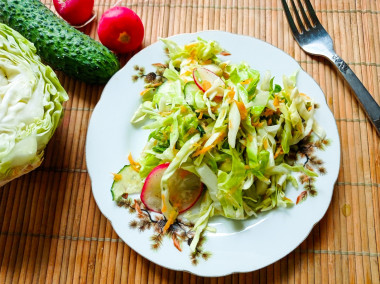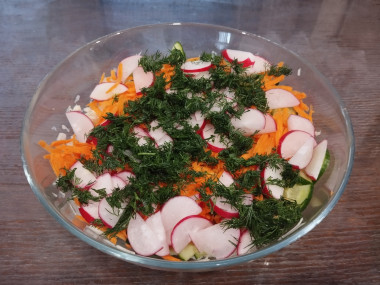 Самый любимый мой салат, делаю круглый год в разных вариациях, я не добавляю перец и редис, так как редис даёт горечь а перец я не люблю, и салат едят детки , продукты всегда доступны.