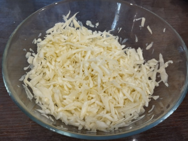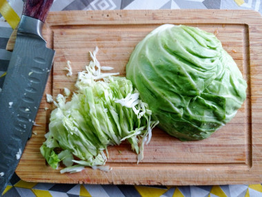 Первым делом нарежьте капусту. Чтобы капуста получилась тонкой, воспользуйтесь специальной шинковкой или теркой. У меня их нет, я режу так — обрываю листы, скручиваю их трубочкой и нарезаю соломкой. Сложите капусту в салатник. Если у вас осенние сорта, помните нарезку руками, чтобы капуста размягчилась и пустила сок.