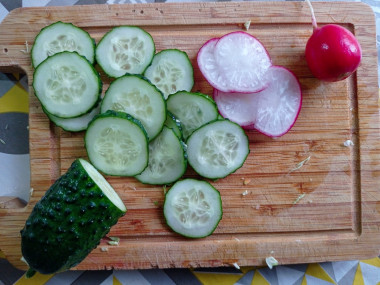 Редиску помойте, обрежьте кончики и также нарежьте на колечки.