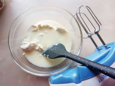В другую чашу выложите творожный сыр и добавьте сгущенное молоко. Смешайте. Сгущенку и сыр перед взбиванием я немного держу при комнатной температуре, чтобы они стали мягче. Если использовать мощный миксер, то можно брать ингредиенты сразу из холодильника. У меня миксер от погружного блендера и твердые продукты ему тяжеловато взбивать.