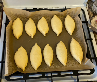 Сформированные пирожки выложите на лист, застеленный пергаментом. Прикройте легким полотенцем и оставьте для расстойки на 20 минут.