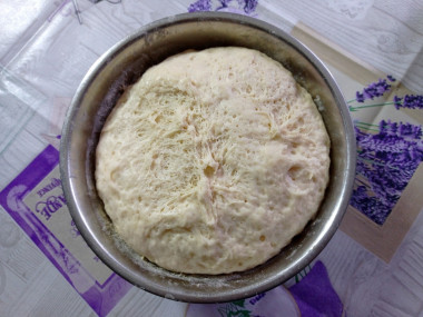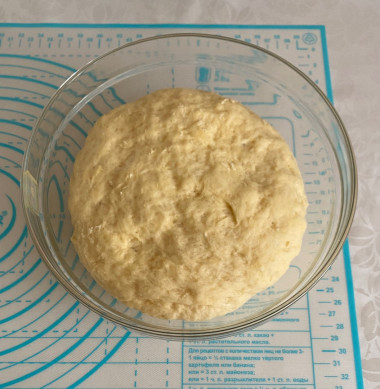 Муки (высшего сорта) у меня ушло около 280 граммов. Яйцо добавила категории С1. Тесто получилось очень нежное, мягкое, немного липнущее к рукам. За 1,5 часа оно увеличилось примерно в 2,5 раза. Тесто разделила на восемь частей весом 55-60 граммов.