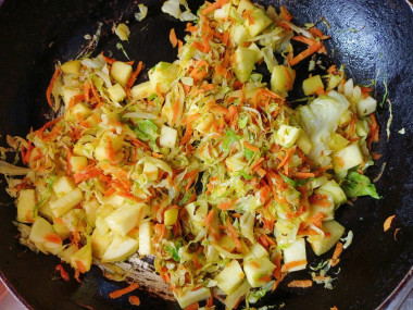 Тушите капусту приблизительно 5-10 минут до мягкости фруктов. Время приготовления будет зависеть от качества овоща и особенностей вашей плиты. Готовую начинку остудите.