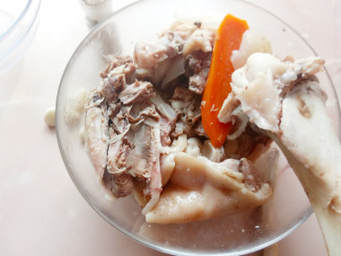 Готовое мясо извлеките из бульона и переберите от костей. Морковь можно использовать для украшения.