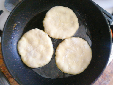 Большую сковороду ставим на средний огонь, наливаем в нее растительное масло, хорошо его прогреваем. Когда это произойдет, нагрев убавляем и выкладываем пышки на сковороду. Обжариваем их под крышкой в течение 3-4 минут (до румяности), затем переворачиваем и жарим еще 2-3 минуты (также до румяности);