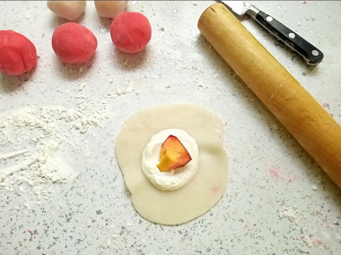 Отмерила сахар и воду, соединила, добавила рисовую муку и размешала венчиком. Краситель у меня был один - алый. Тесто разделила на две части, в одну добавила две капли красителя. В микроволновку миски ставила по отдельности. Сначала "варила" белое тесто, решила, что 1,5 минуты при 750 Вт. будет достаточно. Тесто получилось плотноватым на мой не опытный взгляд). Второе тесто я готовила 30 сек., перемешала и еще 30 сек. Мне кажется это оптимально. Красное тесто получилось помягче. Дальше слегка размяла комочки теста и стала формировать пирожные. Для начинки взяла черешню и нектарин, а так же творожный сыр. Начинку подготовила заранее, чтобы тесто не завертелось. С формированием сначала возникли сложности, но потом поняла, что тонко раскатывать не нужно. Думаю, в следующий раз сделаю эти изделия помельче и в виде пирожка)).
