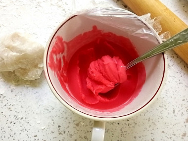 Тесто получилось плотное, не липкое от слова совсем и крахмал чисто «припылить». По цвету думала будет бледнее, т.к. красители по 1 капле и пипетки с очень тонким носиком, а получилось достаточно ярко, опять же какой взять краситель. Плотное тесто трудно собиралось (поэтому и времени поменьше в микроволновке, я подумала).