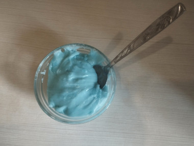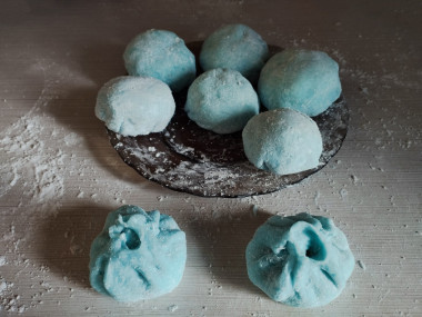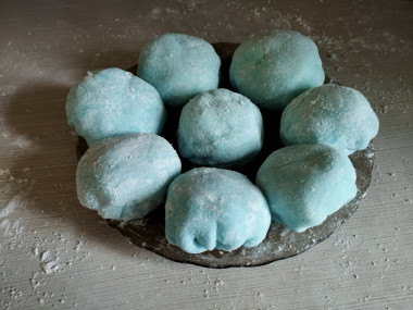 Цвет использовала синий и краситель взяла для яиц, вода была синего цвета, а моти получились бирюзовыми, т.е. нужно учитывать, что мука то белая и если нужен яркий цвет, то и красителя больше.