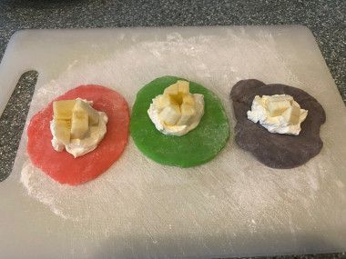 Тесто остудите до теплого состояния. Разделите его на одинаковое количество частей. Этот рецепт рассчитан на 6 пирожных. Так как я делаю три цвета, каждый я делю на 2 части. Скатайте из куска теста колобок, немного вымесите его на доске, присыпанной кукурузным крахмалом. Затем раскатайте в круг, толщиной несколько миллиметров. Сильно толстым не делайте, так как тогда моти будет тяжело залеплять. Очень тонко тоже не раскатывайте, чтобы тесто не порвалось.