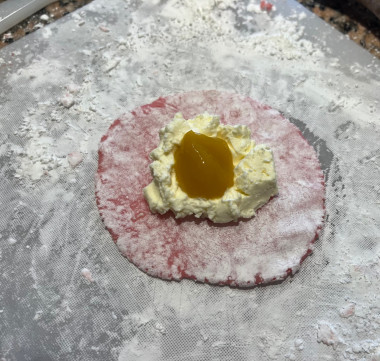 Когда начала раскатывать тесто очень сильно прилипало к скалке, добивала его крахмалом - впитало слишком много крахмала и это повлияло в итоге на вкус. Скорее всего нужно было его чуть подержать еще в микроволновке, крахмала много не нужно, вкус стал хуже.