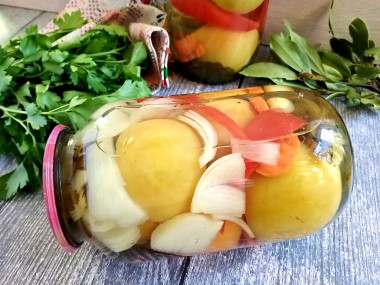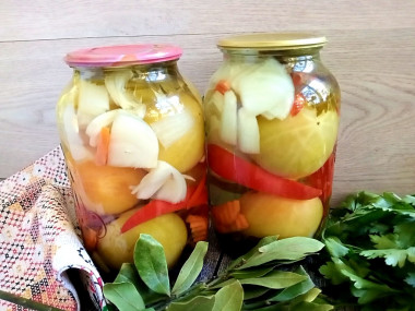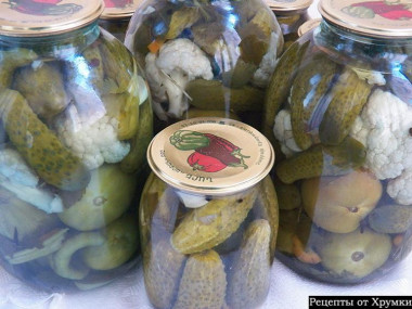 Наконец то вчера законсервировала смешанные овощи. Готовлю по тому же рецепту как мариновала огурцы, только на трехлитровую банку специи * на 3 Выглядит примерно так: