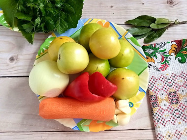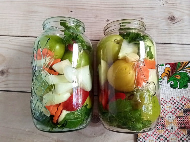 Занялась консервированием зеленых помидоров на зиму. Решила закатать две полуторалитровые банки по этому рецепту. Порадовало, что кроме помидоров здесь есть и другие овощи. Значит заготовка получится очень вкусной и ароматной!