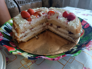 Украсьте верх ягодами. Подавайте бисквитный торт с клубникой и кремом чиз к столу. Приятного аппетита!