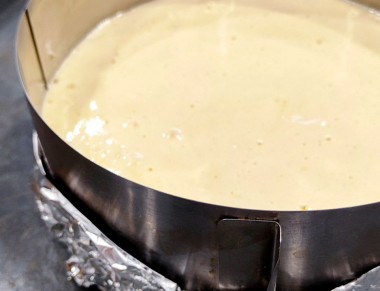 Возьмите подходящую форму для выпечки, у меня кольцо диаметром 20см, дно я сделала из фольги. Смазывать форму не нужно. Вылейте в нее тесто.