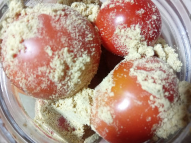 Насыпьте к помидорам порошок горчицы и перец горошком.