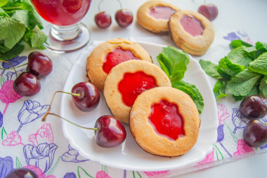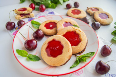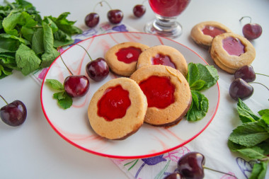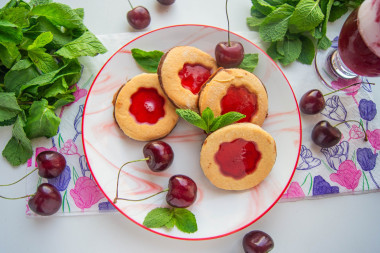 В углубления в печенье влейте ягодное желе. Поставьте печенье в холодильник на 30 минут или дольше до застывания желе.