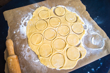 Охлажденное тесто раскатайте в пласт толщиной 5 мм. Формочкой вырежьте четное количество заготовок. Остатки теста между заготовками соберите в шар, раскатайте и снова вырежьте заготовки.
