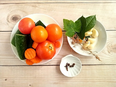 Как сделать овощное ассорти - огурцы с помидорами на зиму маринованные? Подготовьте необходимые ингредиенты. Все овощи тщательно промойте. Огурцы залейте холодной водой и оставьте минимум на 2-3 часа. Благодаря этому он получатся хрустящими. Через тир часа огурцы ещё раз обмойте и обрежьте кончики с обеих сторон. О