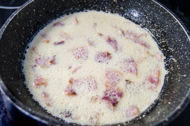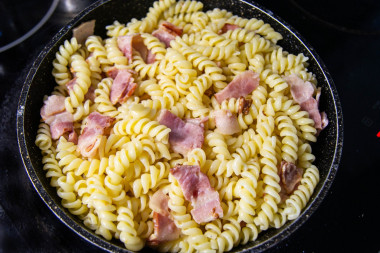 Сразу поставьте на плиту кастрюлю для варки макарон. Воды должно быть много — на каждые 100 грамм 1 литр. Одновременно разогрейте на среднем огне сковороду, налейте на нее немного растительного масла для жарки. Масло необходимо, несмотря на то, что бекон содержит жир — оно поможет быстрее ему вытопиться. Выложите в сковороду кусочки бекона. Обжаривайте его, помешивая, до золотистого цвета. Когда вода закипит, добавьте в нее соль и всыпьте макароны.
