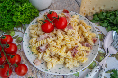 Макароны получились с очень вкусным и нежным сливочным соусом, а бекон хорошо дополнял этот вкус.