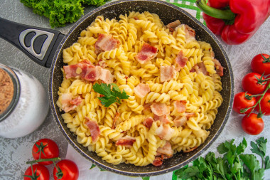 Подавайте макароны с беконом в сливочном соусе на сковороде к столу, можете еще дополнительно посыпать их натертым сыром и зеленью. Приятного аппетита!