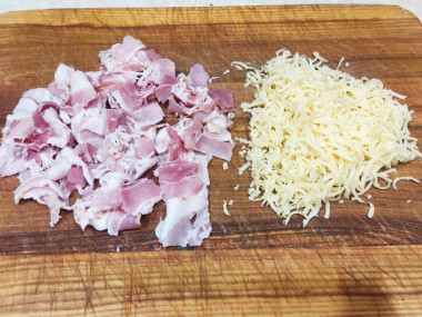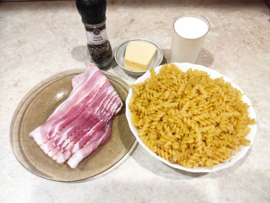 Оставалось немного сливок и подумала, что можно приготовить их с макаронами. Нашла рецепт "макароны с беконом, сливками и сыром" и решила готовить по нему. Подкупила бекона и сыра, и начала готовить.