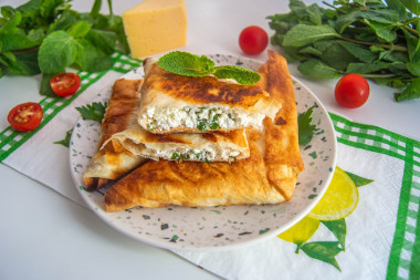 Захотелось приготовить на завтрак что-то недолгое и сытное. Как раз оставался лаваш и творог. Наткнулась на рецепт "хачапури из лаваша с творогом на сковороде". Быстренько собрала все ингредиенты. Промыла петрушку и мелко нарезала. Сыр натерла на терке. Смешала все ингредиенты для начинки: творог, сыр, петрушку, соль, перец. От себя еще добавила в начинку сметану, так как творог был суховат. Выложила начинку на лаваш, смазала края взбитым яйцом и завернула как показано на фото. Готовые треугольники обжарила на растительном масле с двух сторон. Завтрак получился быстрым и очень сытным. Мне хватило двух штучек, чтобы наесться. Мужу особенно понравилась начинка внутри хачапури.