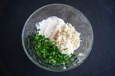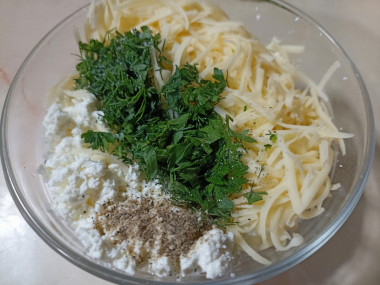К творогу добавьте сыр, зелень и растительное масло. Начинку посолите, поперчите по вкусу и перемешайте.